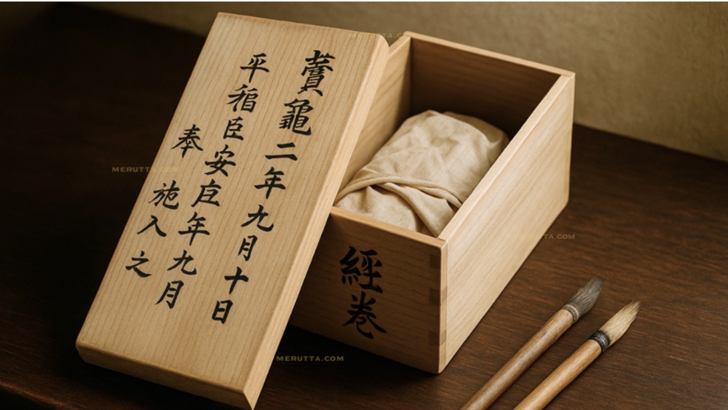 The scrolls preserved in Shōsōin are neither literary narratives nor instructional texts. They are Buddhist sutras, kyōten, meticulously transcribed by hand. Many are written in gold ink on dark paper. This choice was not decorative, but contemplative: against deep blue or lacquer-black surfaces, the golden script appears to emerge from emptiness — like light from darkness, or thought from silence.
